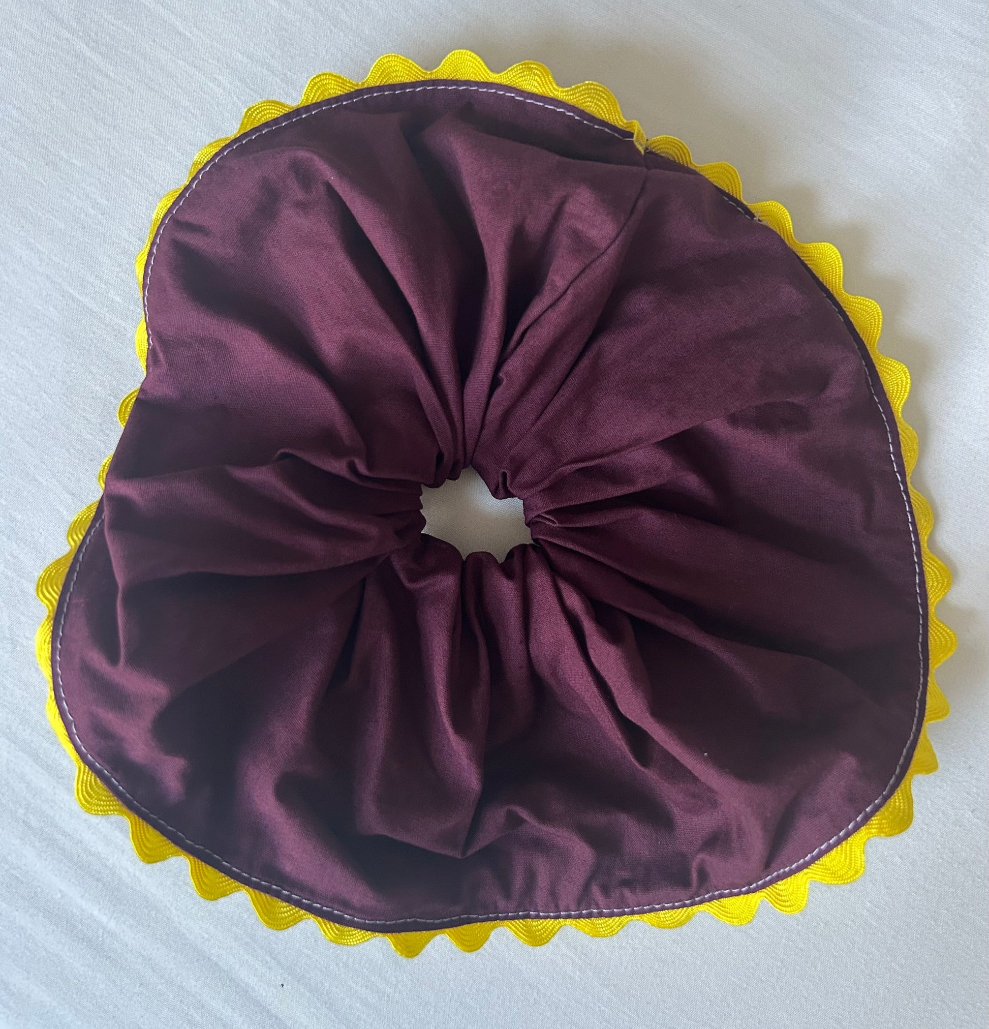 🍆 This Dress has been hand dyed to this gorgeous plum red colour using Dylon. The base is 100% cotton in a light lilac and white so you can still see a hint of stripe in the plum red. Contrast lilac stitching throughout yellow ric rac on scrunchie for a pop of colour.
